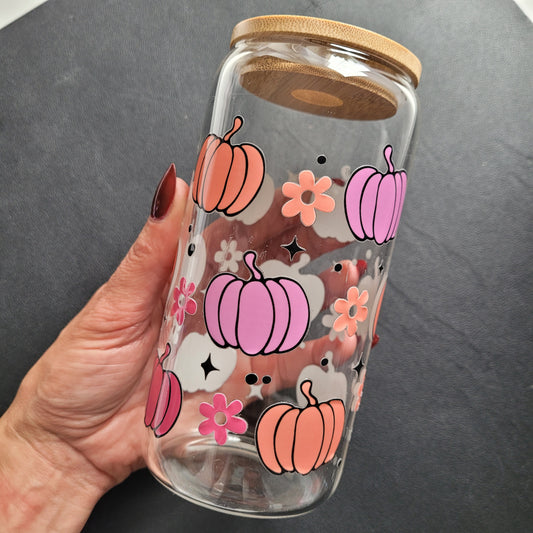Trinkglas PINK PUMPKIN | Glas mit Deckel und Strohhalm I Eiskaffee Glas I Wiederverwendbares Trinkglas