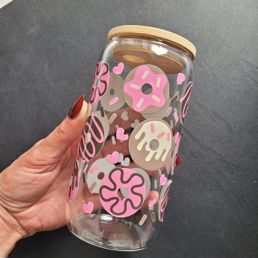 Trinkglas DONUTS | Glas mit Deckel und Strohhalm I Eiskaffee Glas I Wiederverwendbares Trinkglas