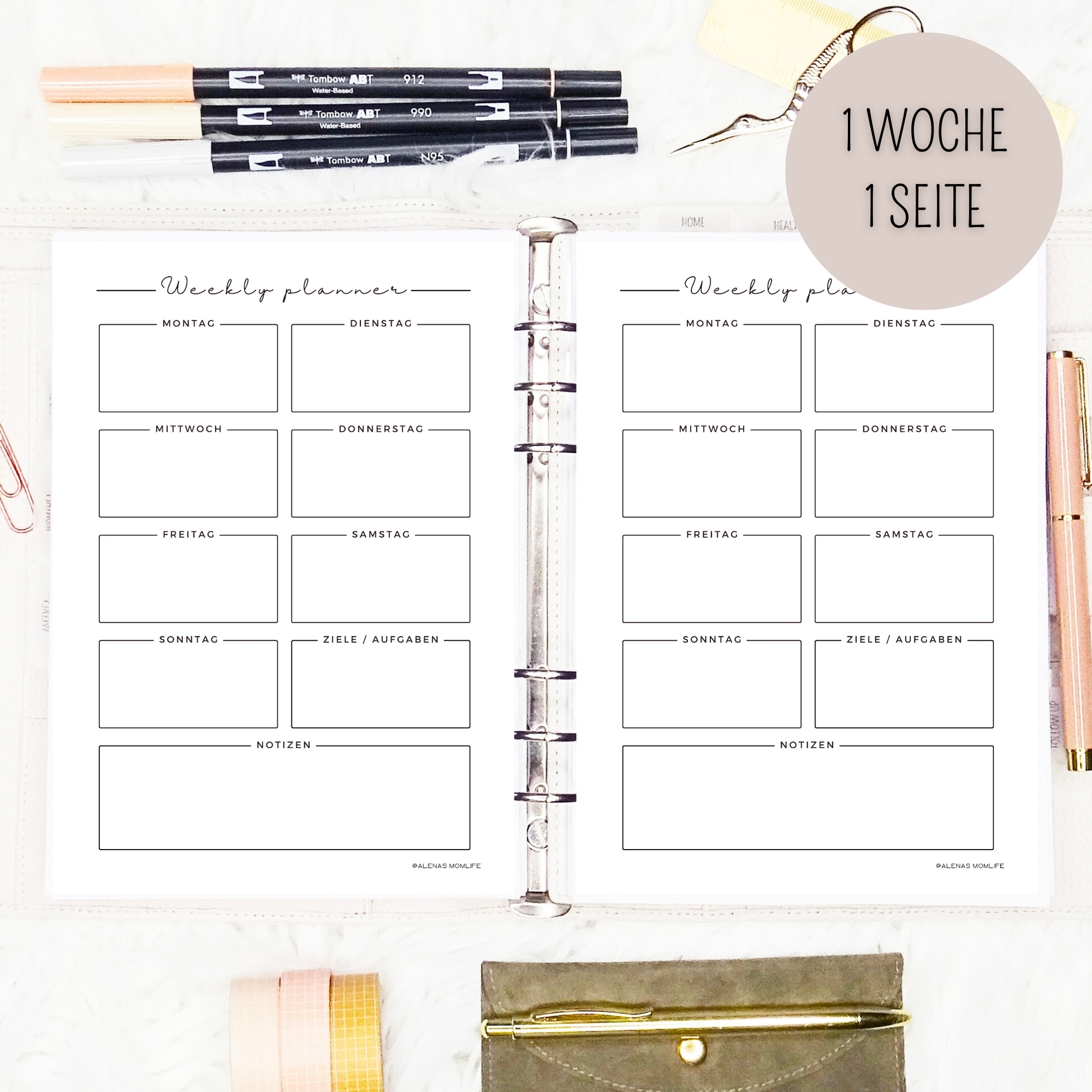 Die Wochenkalendereinlagen in Papierform sind dein idealer Begleiter, wenn du deine Termine und Ziele lieber handschriftlich festhältst. Auf hochwertigem Papier bieten sie Platz für deine täglichen Notizen, To-Do-Listen und wichtige Ereignisse. Kompakt und praktisch passen sie perfekt in deinen Planner oder dein Notizbuch und sind eine charmante Alternative zu digitalen Planungstools. Organisiere deine Woche auf eine traditionelle, persönliche Art und behalte stets den Überblick über deine Zeit.